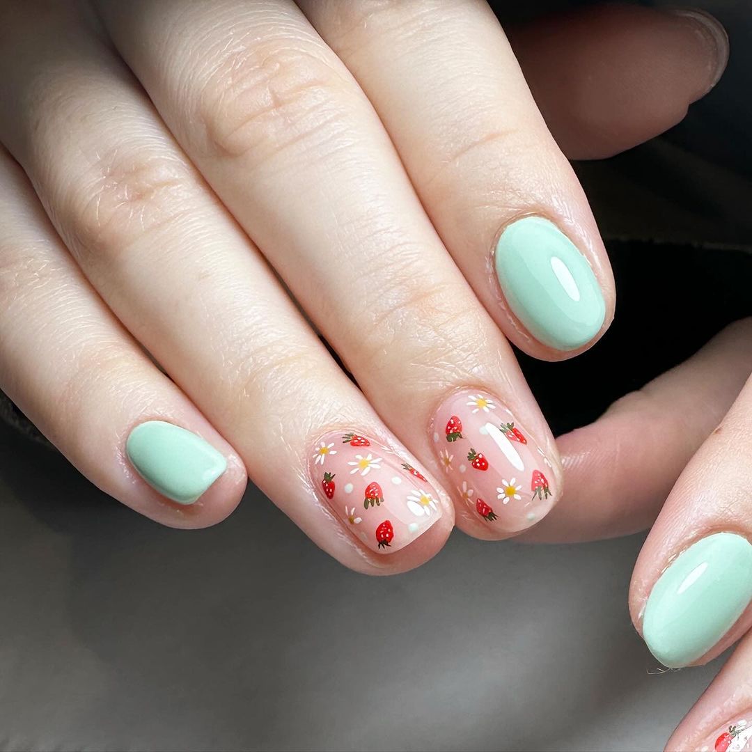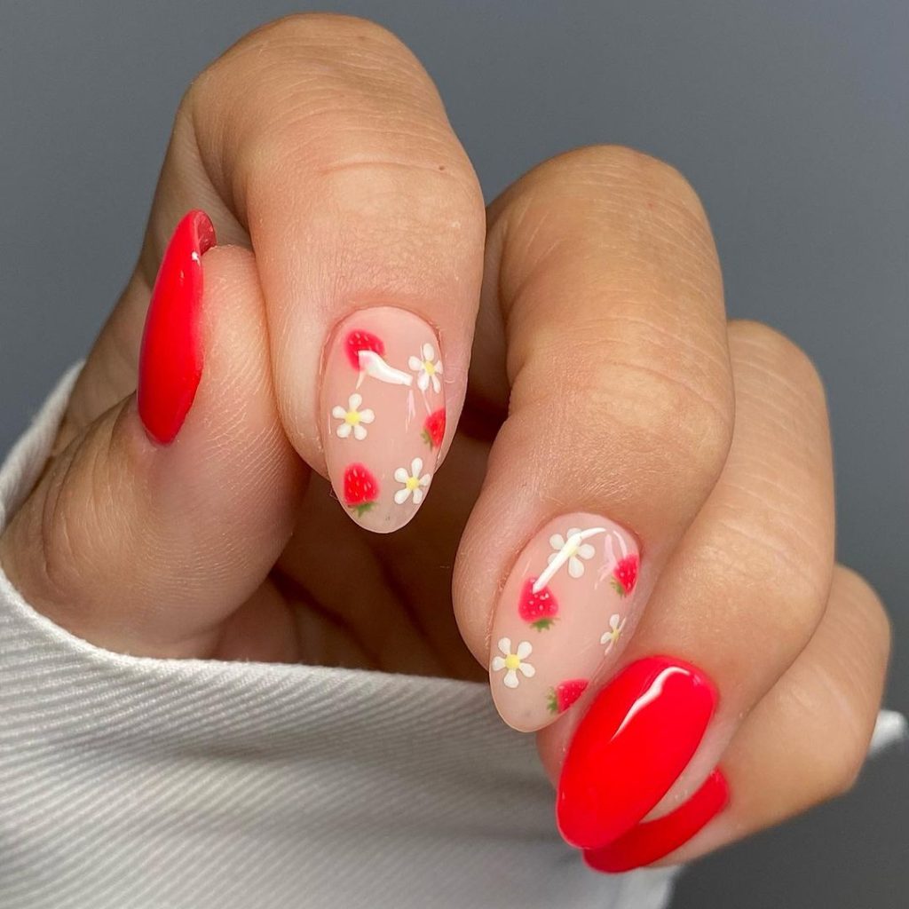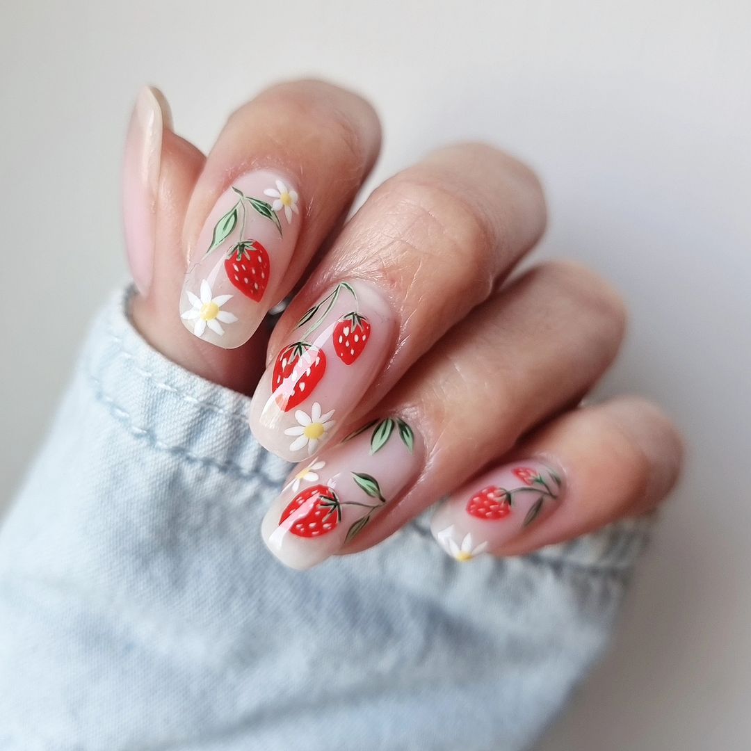50. Adorable Strawberry & Daisy Nails