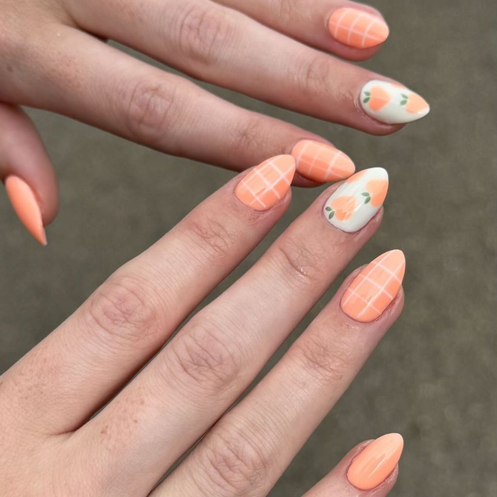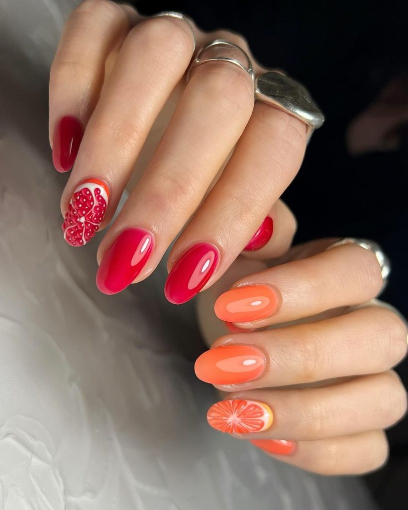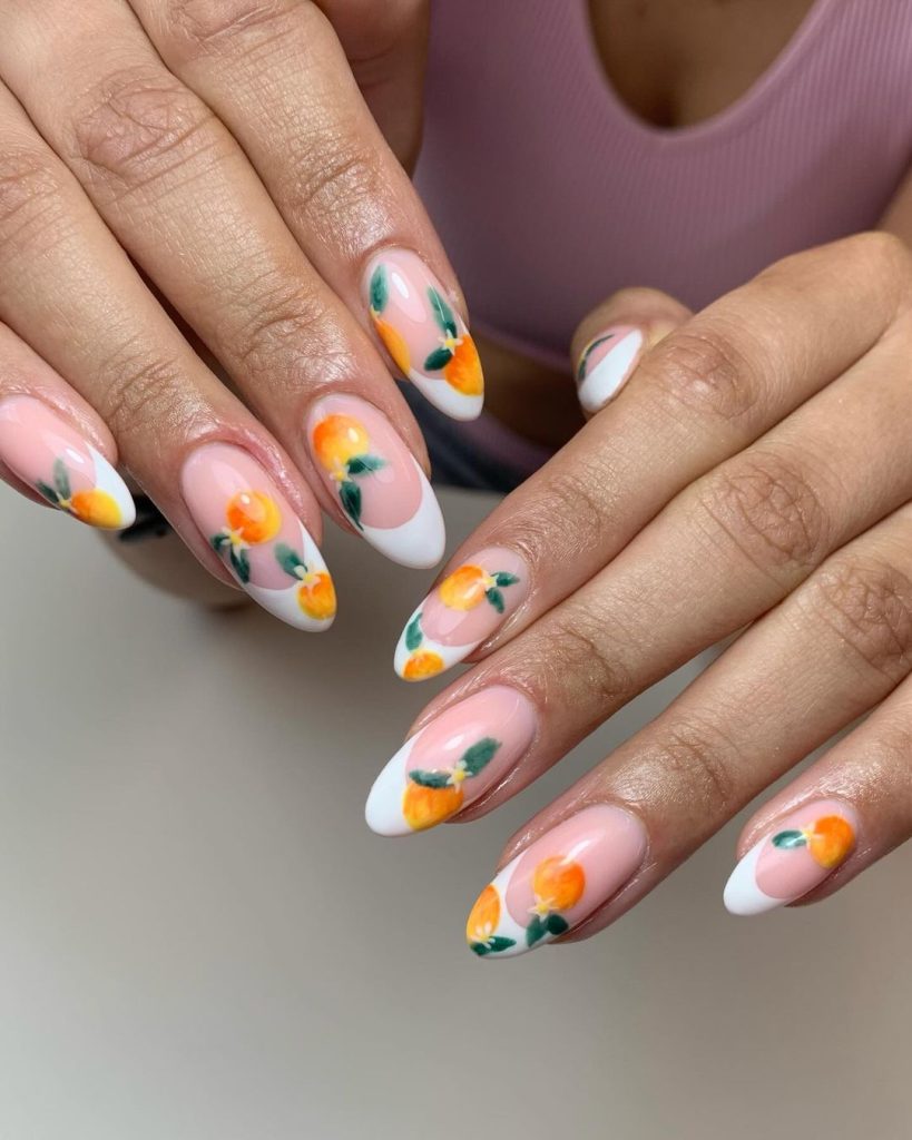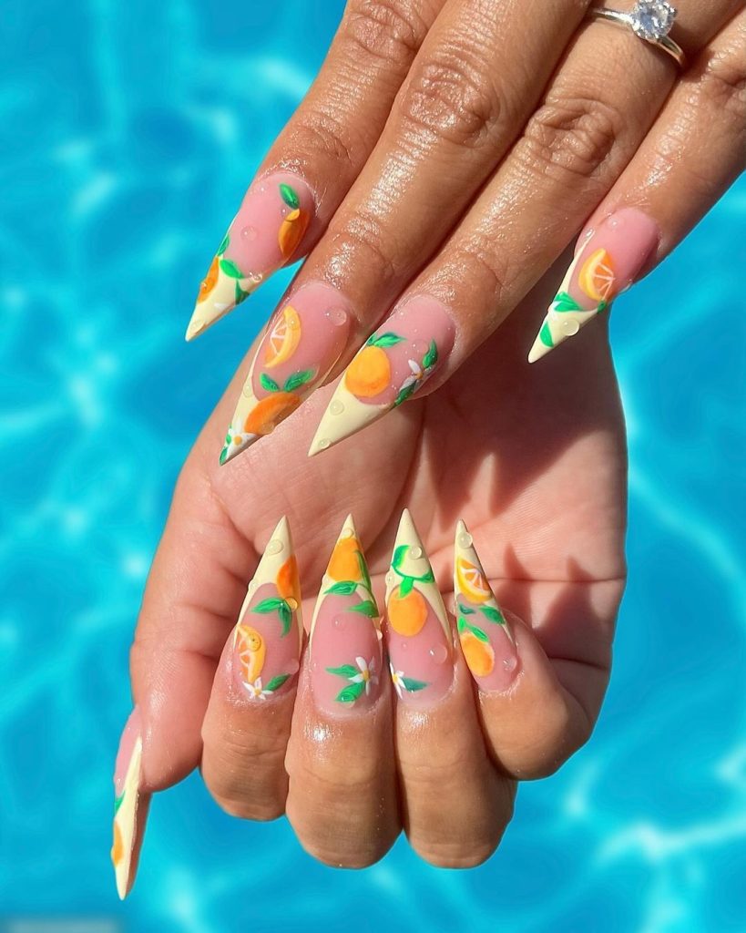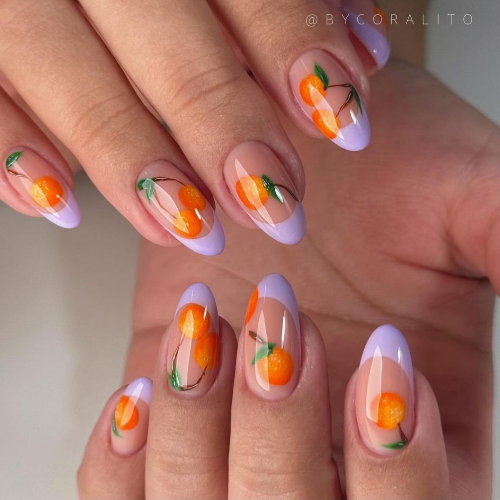 Orange Fruit Nails are fresh and vibrant. The bright orange color and detailed fruit designs make these nails perfect for summer.
