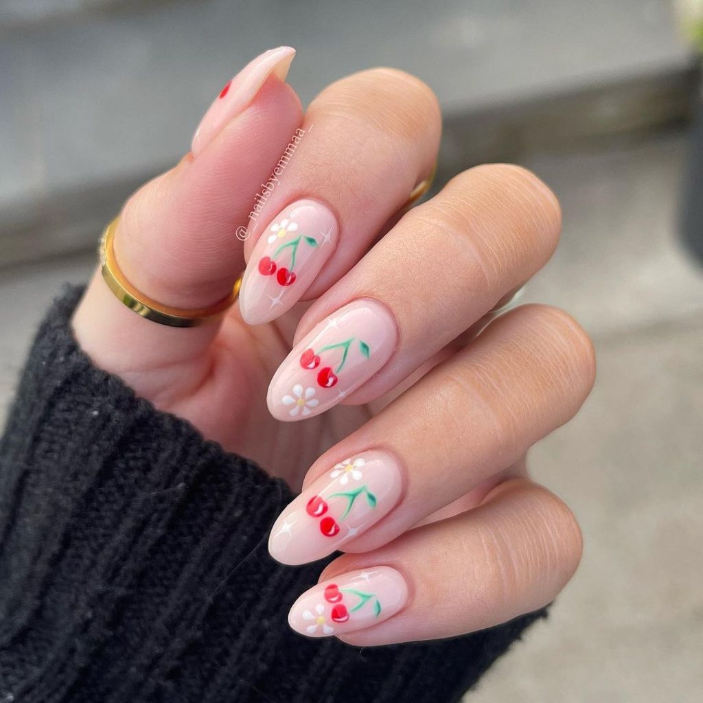 Little Fruits On Nude Nails are cute and subtle. The tiny fruit designs on a nude base give a stylish yet understated summer look.