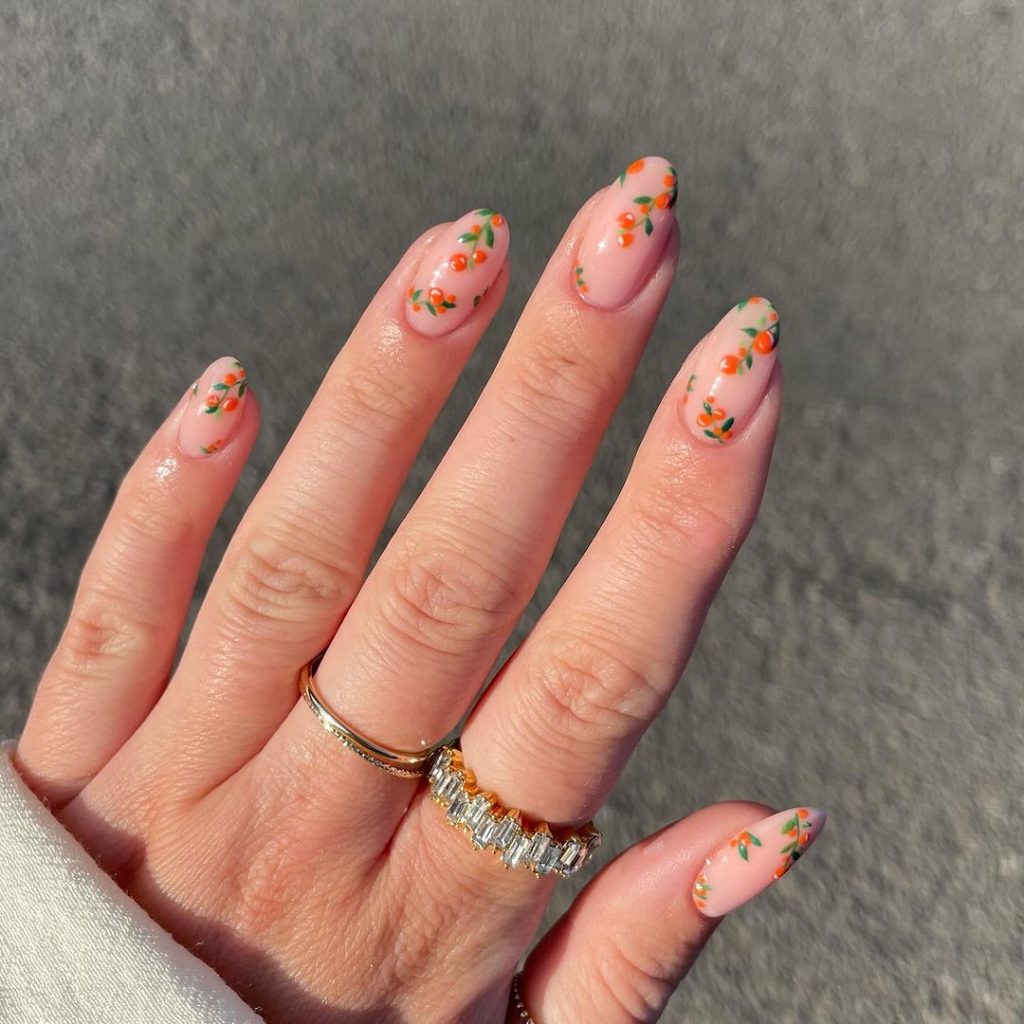 Nude Oranges Nails are chic and subtle. The tiny orange designs on a nude base add a playful touch to a classic look.