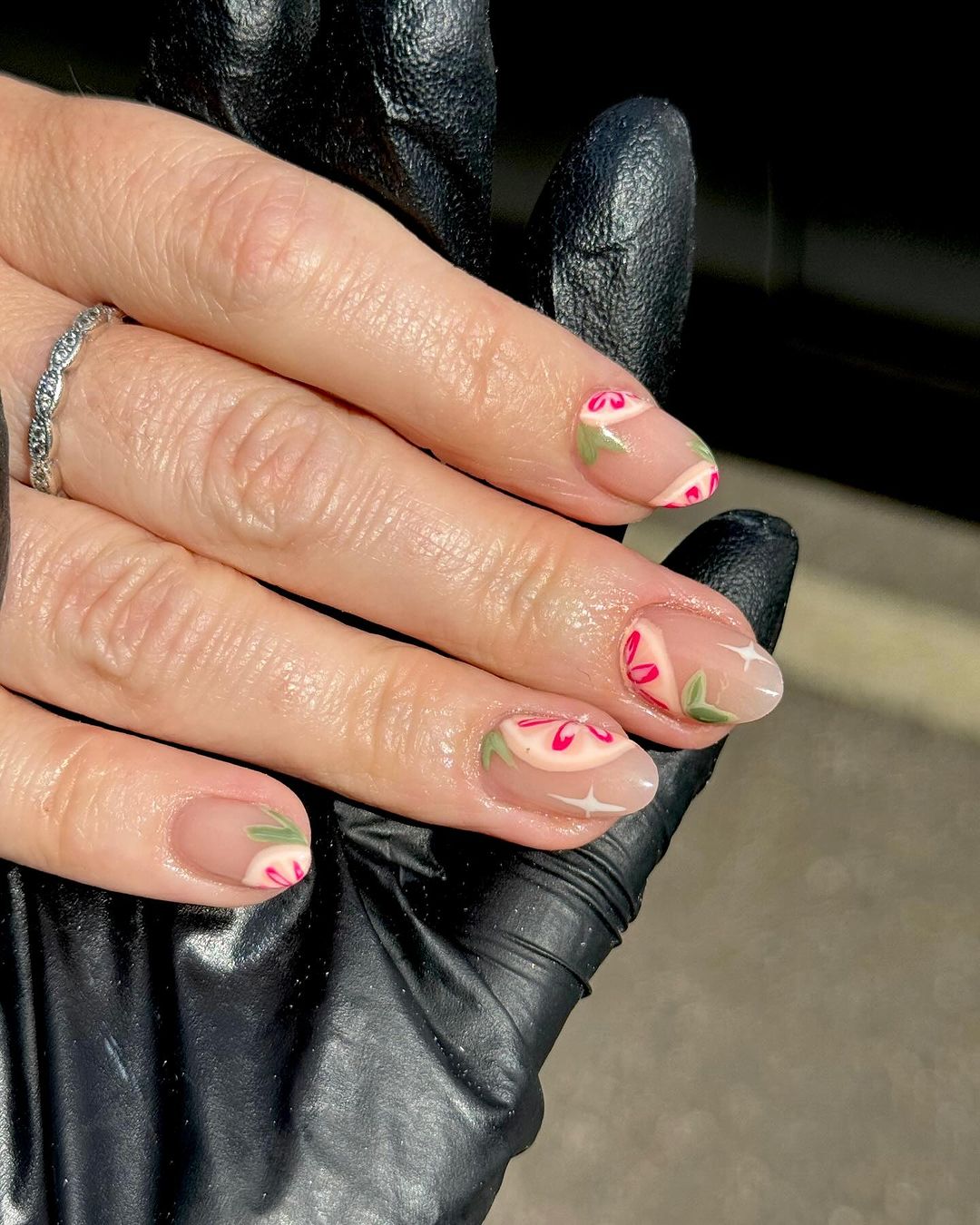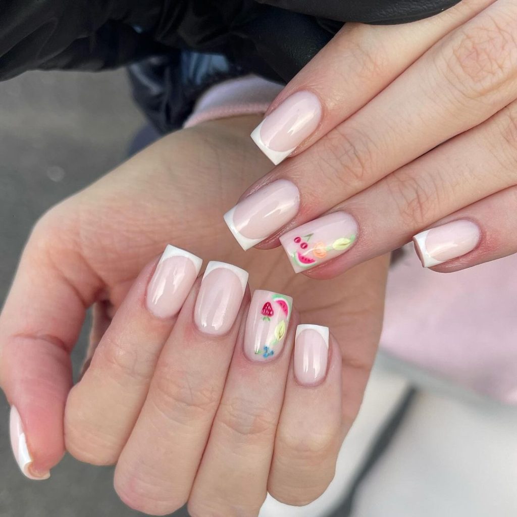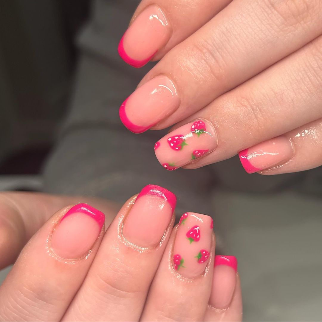 Pinky Frenchies Nails are a twist on the classic French manicure. The pink fruit designs add a fun and playful touch to a timeless style.