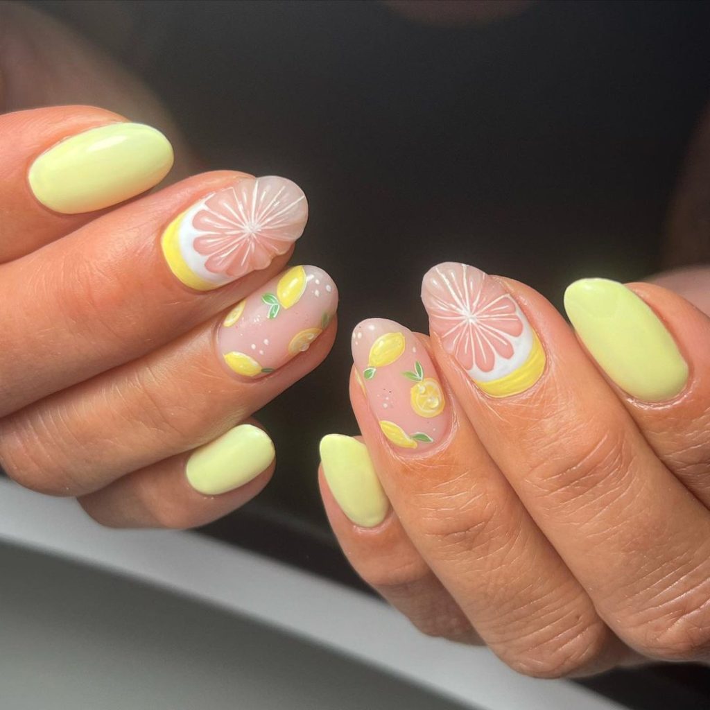 Minimalist Lemon Nails are refreshing and clean. The small lemon designs on a nude base give a subtle yet stylish summer vibe.