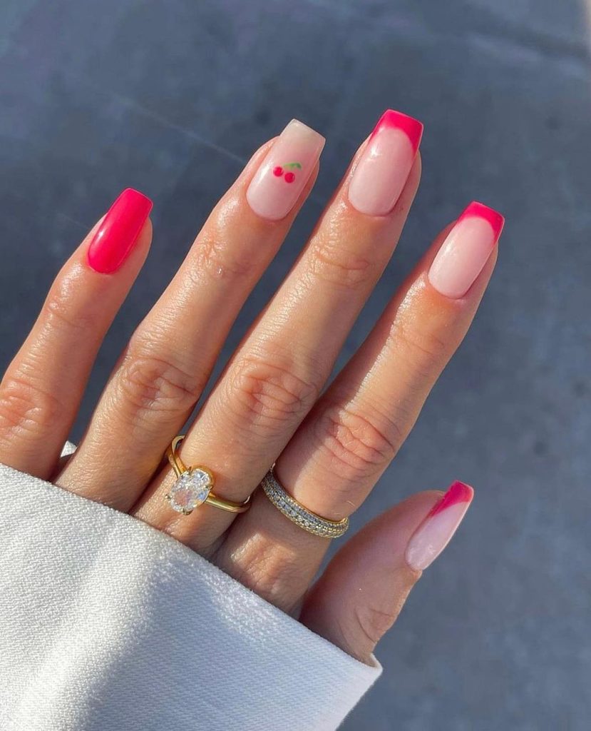 Pinky Strawberry Nails are sweet and playful. The combination of pink and strawberry designs is perfect for a cute and fun summer look.