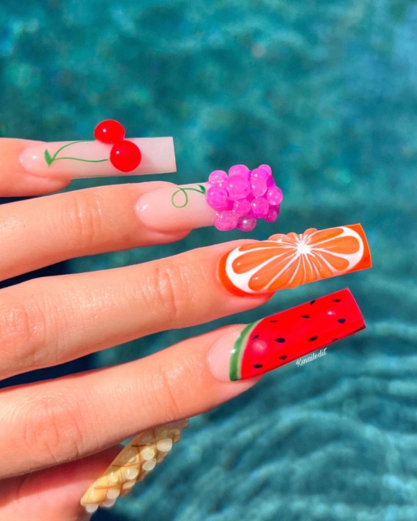 Nails For Warm Weather are bright and cheerful. These nails feature a variety of fruit designs that are perfect for celebrating summer.