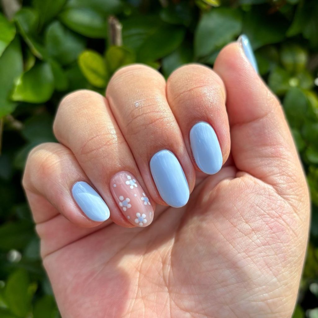 47. Baby Blue Nails With White Daisies
