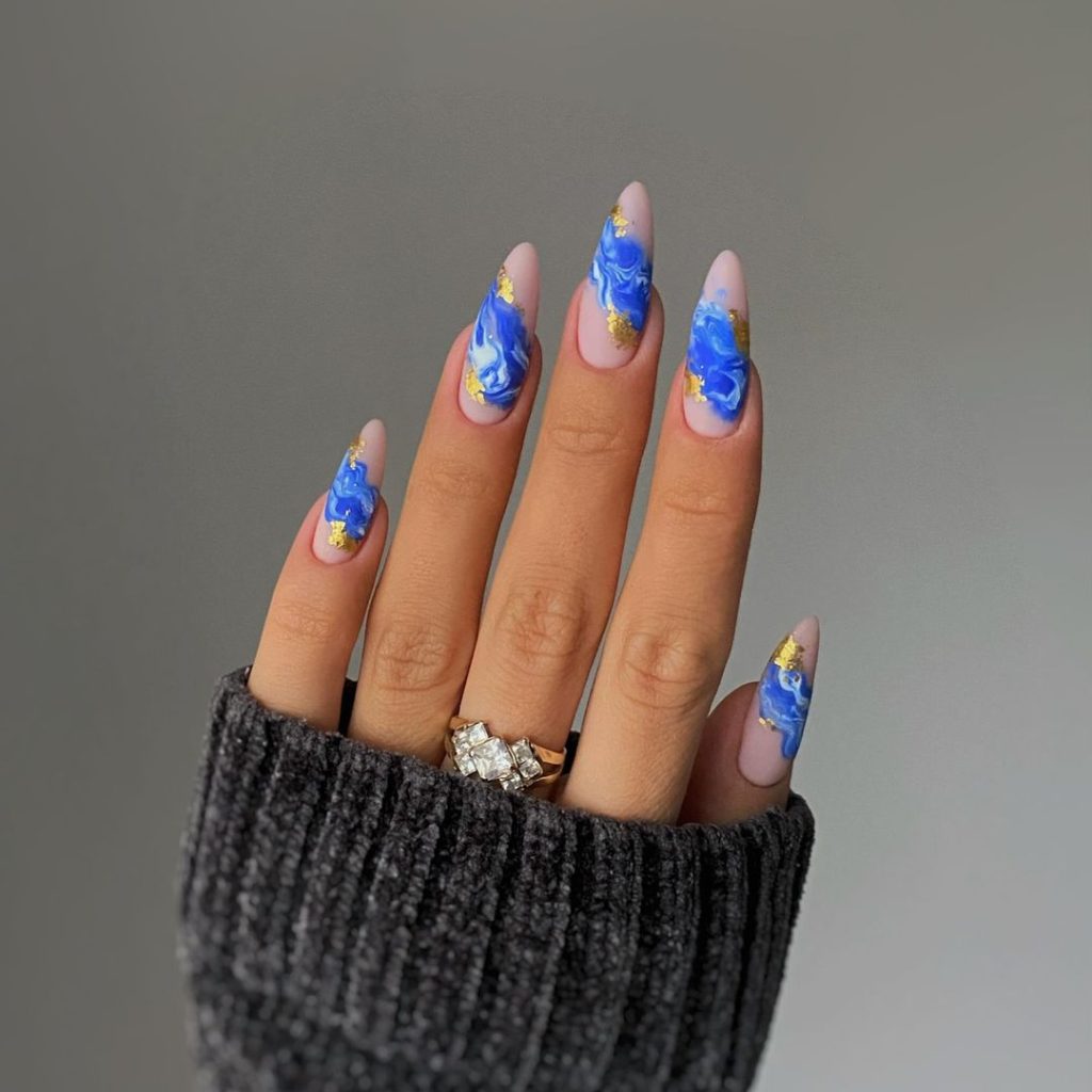 25. Blue Marble Nails With Golden Glitter