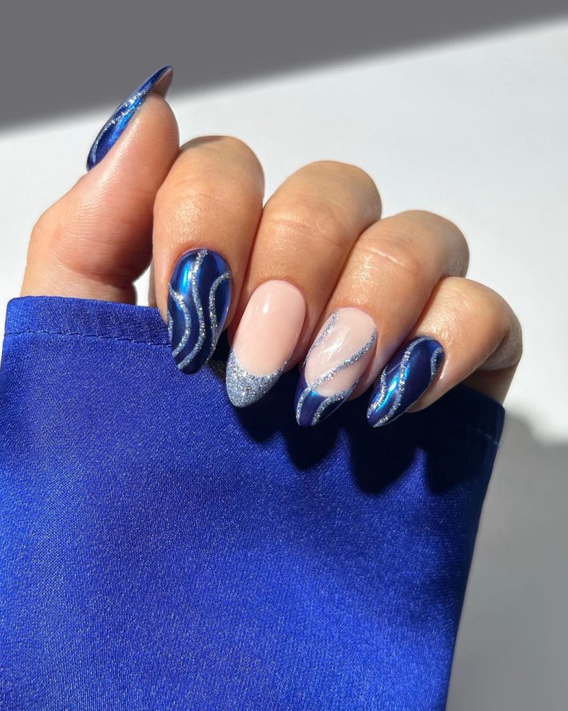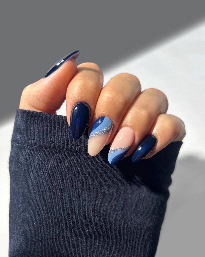19. Night Blue Swirls Nails With A Sliver Of Sparkle