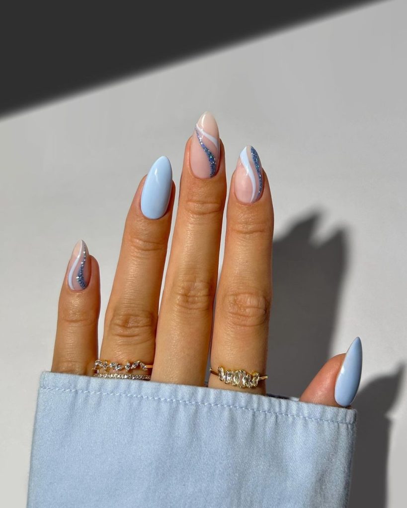 17. Pale Blue Swirls Nails With Sparkle