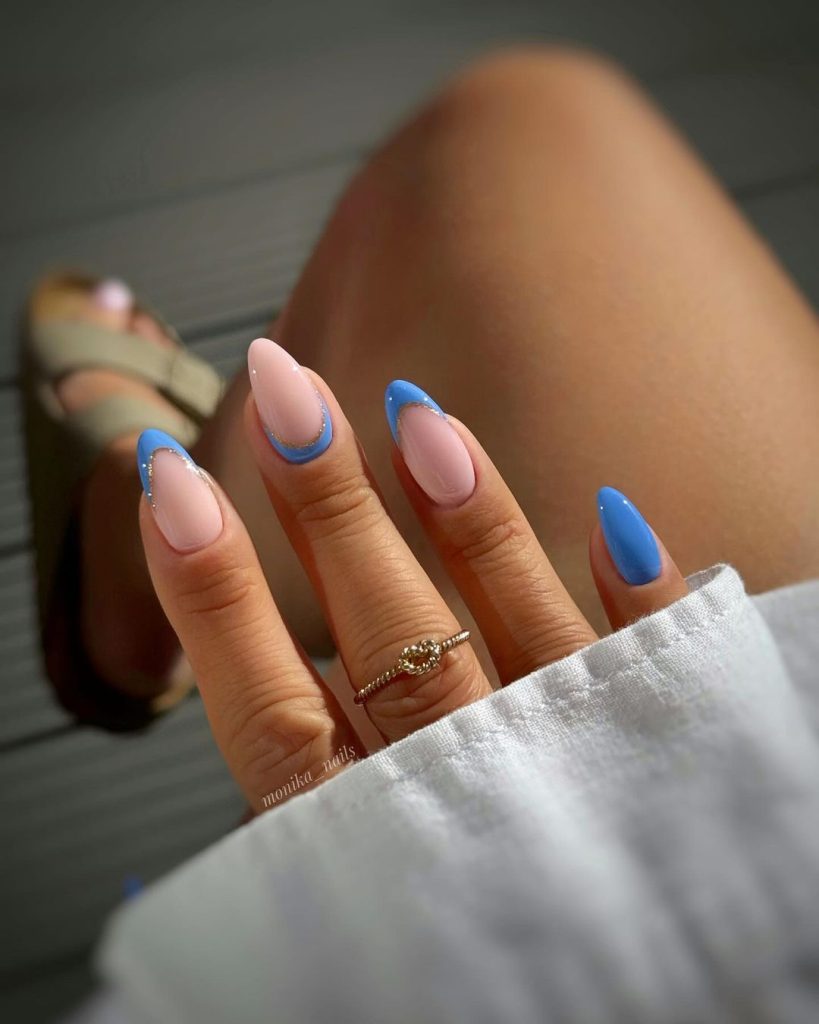 Add a girly sparkle with a touch of gold on blue nails for a glamorous finish! This design blends vibrant blue with shimmering gold accents, creating a chic and sophisticated look that’s perfect for any occasion.