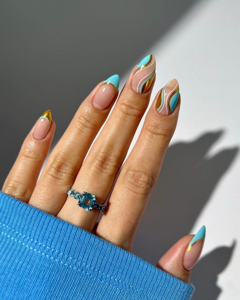 urquoise and gold mix & match nails are all about luxurious contrast! They’re perfect for when you want to dazzle with a touch of glamour. These nails are ideal for a bold and fabulous look.